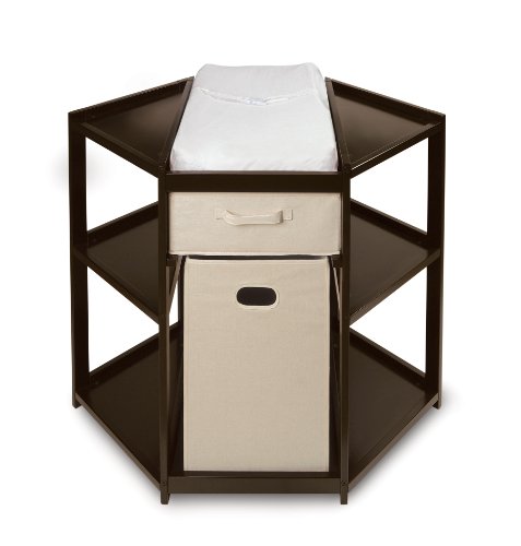 Capitalize on the corner space in Baby’s nursery. Includes a hamper and storage basket/drawer. Hamper is independent of the table and can be removed for carrying laundry to the laundry room If you aren't using the hamper, your diaper pail will fit conveniently into that spot, too. Hamper measures 13. 5" W x 13. 5" D x 21. 5" H. Pull-out basket is a convenient drawer for storing diapering supplies or baby clothes. Basket can be removed giving you a taller open storage area. Basket measures 16" W x 17. 75" D x 6" H. The table also features shelf storage space on either side of the changing area and on both sides below. Measures about 33. 5" high to the top of the contoured, 16" x 31" x 3 inch changing pad. Measures 31" from the back corner to the front edge; 40. 25" across the widest measurement from corner to corner. Also includes a safety belt and one white, terry cloth changing pad cover (fabric is 80% polyester/20% cotton). Wipe the table clean with a damp cloth and mild soap. Dry thoroughly. Table is made with wood, multi-layer wood and wood composites, and veneers. All paints and finishes are non-toxic. Assembly required; illustrated instructions included. Toys and accessories shown with the table are not included except as mentioned above. Changing table can be used with children weighing up to 30 lbs. (13. 6 kg). Meets all current safety and testing standards. All measurements approximate. This item ships in its original carton which may include a photo of the product. Helpful handles on the hamper for lifting and carrying. Remove the bottom insert panel in the hamper or basket and they fold flat for storage. Covered in durable fabric with reinforced binding around all edges. Hamper fabric a 65% polyester/35% cotton blend and can be spot cleaned with a damp cloth. Basket fabric a 80% polyester/20% cotton blend and can be spot cleaned with a damp cloth. Do not immerse the hamper or basket in water.