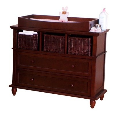 The beautiful BSF Baby Addison Changer/Organizer in espresso adds a graceful appearance to your baby's nursery. The three drawer dresser stores clothing , bedding and supplies. The top makes a perfect spot for changing baby. The changing station is detachable from the dresser. Baskets shown in photo are not included.